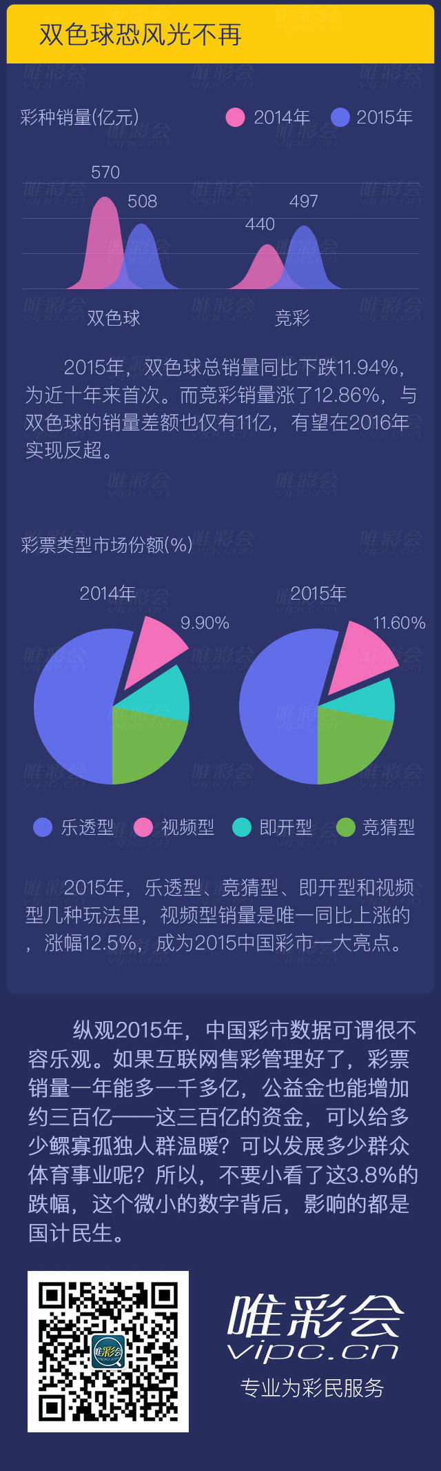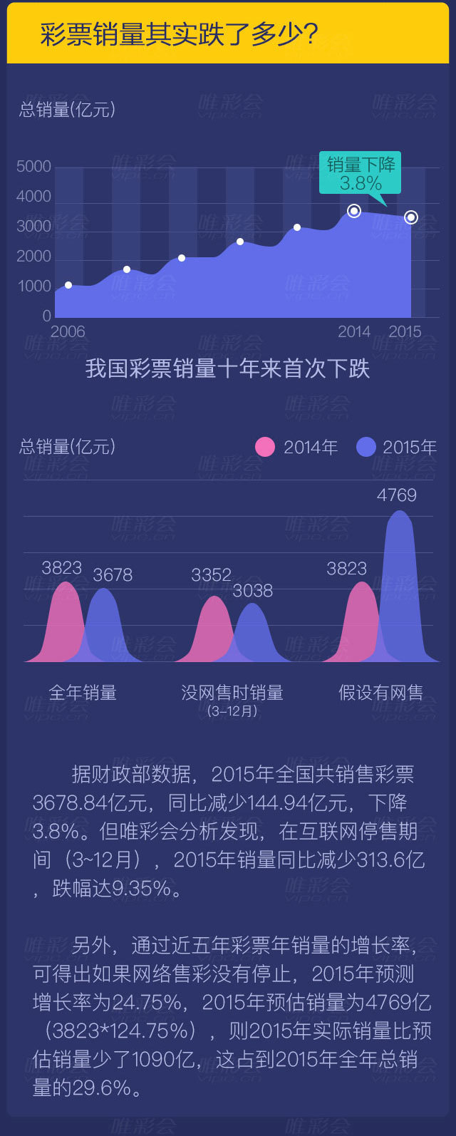 1月21日,财政部发布了2015年彩票销量报告,报告显示2015年全国彩票销量为3678.84亿元,下降3.8%。在2015停售风暴下,彩票销量数据背后隐藏了怎样的故事呢?24直播网带你一图读懂2015中国彩票销量数据。