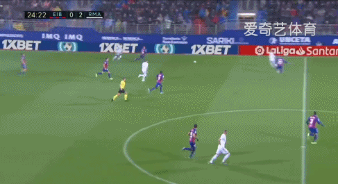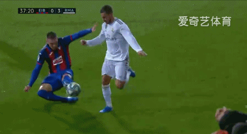 除了制造点球之外,阿扎尔在本场比赛还有不少精彩突破,其中最令人叫好的一次发生在第25分钟。当时皇马从后场发起快速反击,门迪直传,阿扎尔背身拿球,面对埃瓦尔后卫阿韦利亚紧逼防守,阿扎尔顺势脚后跟一磕穿裆传给队友。