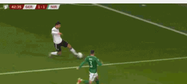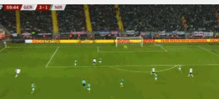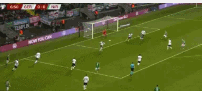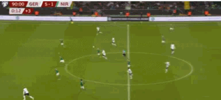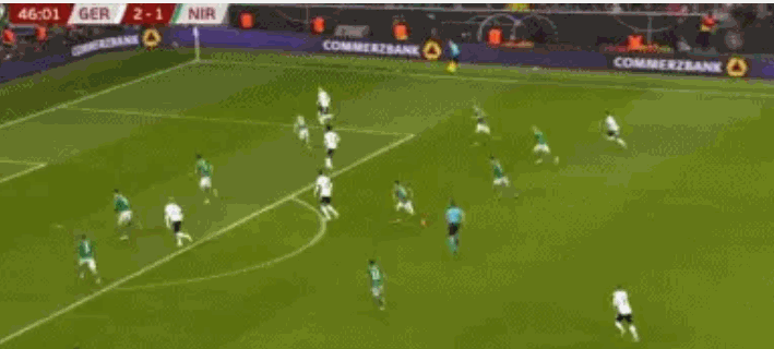 补时阶段,克罗斯中路过顶长传,布兰特反越位成功,禁区内左脚抽射破门,6-1!最终,德国队主场6-1逆转北爱尔兰。