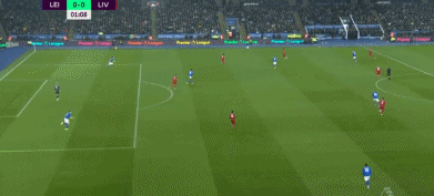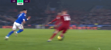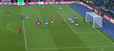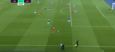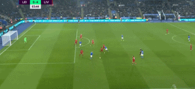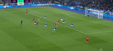 第74分钟,菲尔米诺前场右路得球转身传球,米尔纳得球分边,亚历山大-阿诺德前场右路右脚低平球传中,菲尔米诺后点得球右脚推射梅开二度,莱斯特城0-3利物浦。