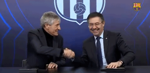 发布会前,塞蒂恩一早来到了巴萨训练基地,指导了第一场训练课。结束训练课后,塞蒂恩正式与巴托梅乌签署了执教协议,巴萨官推第一时间发布了签约现场视频,塞蒂恩看起来非常激动,而与他握手的巴萨主席巴托梅乌则掩不住笑意。