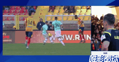 第20分钟,多纳蒂蹬踏巴雷拉小腿,主裁判第一时间出示黄牌,在经过VAR确认之后,维持了原判罚。