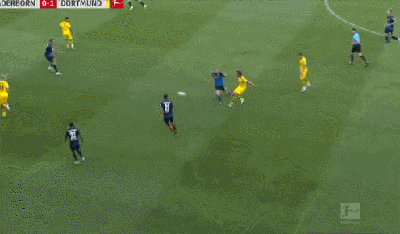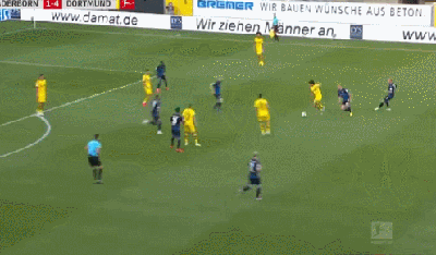 第85分钟,小阿扎尔带球突破杀入禁区后被断,前插的施梅尔策得球内切后送出横传转移,禁区右侧的阿什拉夫将球一停后右脚抽射破门得分!1-4!客场作战的多特取得三球领先!