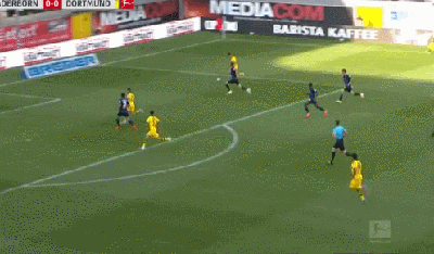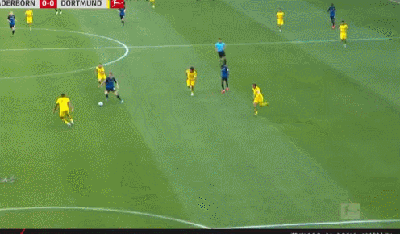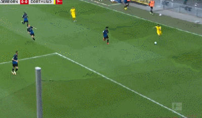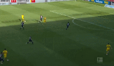 第90分钟,维特塞尔送出长传,桑乔走右侧一路杀入禁区,他选择自己直接推射将球打进,多特蒙德6-1帕德博恩!