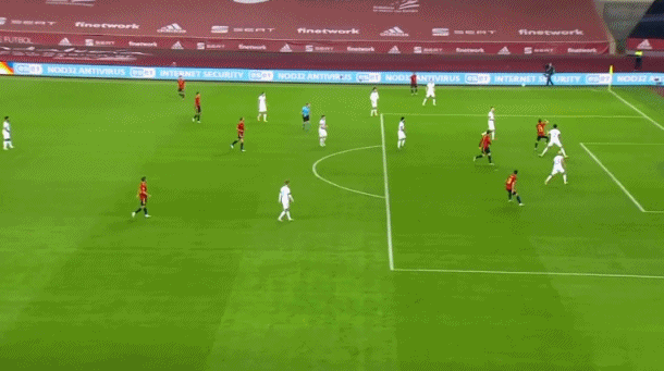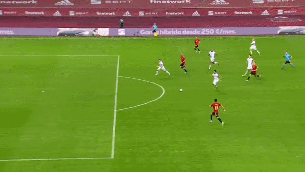 第54分钟,法比安-鲁伊斯挑传,加亚突破到禁区左侧后横传,费兰-托雷斯调整后铲射得分,西班牙4-0德国!