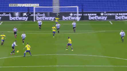 12月20日讯 西班牙人vs阿尔梅里亚的比赛,最近状态火热的德托马斯中圈挑球过人,不看球门,半场直接吊射破门。西班牙人1-0领先。