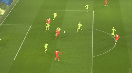 第14分钟,萨内在反击中带球突进,随后把球分向右路,坎塞洛精准地传向后点,科曼凌空抽射破网!