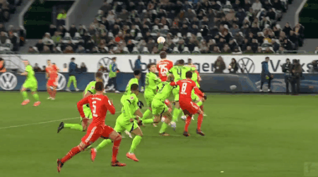 第9分钟,拜仁取得领先,科曼在巴库的防守下内切传中,穆勒跳起抢点没有碰到皮球,卡斯特尔斯受到干扰,只能目送皮球入网!