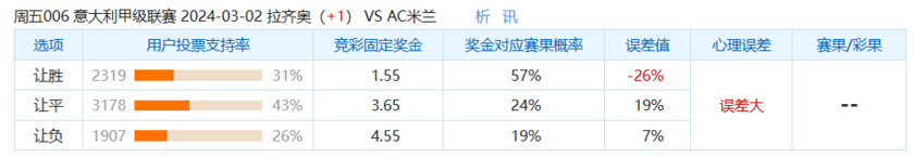 这场比赛中,选择拉齐奥获让胜的球迷比较少,只有31%的球迷选择了让胜选项,看来很多球迷都相信AC米兰能在本场比赛中取得胜利甚至大胜,这也与奖金对应赛果概率的57%相差了26%