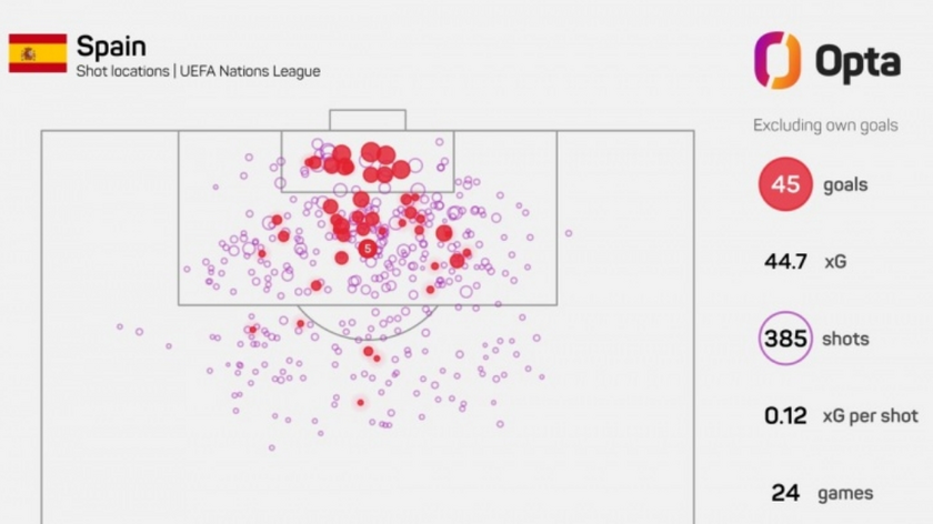 Opta说到,西班牙在欧国联比赛中射门385次、进球46粒(1粒为对手乌龙),均为赛事历史最多,平均控球率66%,所有参赛球队中最高,战绩为13胜6平5负。