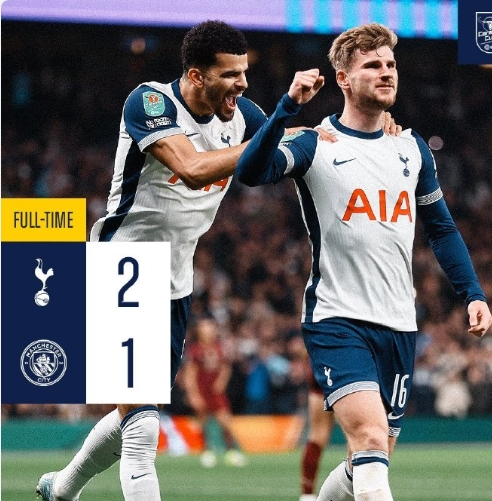 比赛中,上半场维尔纳赛季首球+破234天进球荒,萨尔远射扩大比分,库卢两助攻,努内斯扳回一城,范德文伤退,下半场维尔纳失单刀,理查利森失良机,萨维尼奥伤退。最终热刺主场2-1淘汰曼城晋级联赛杯8强,蓝月亮遭遇本赛季各赛事首败。