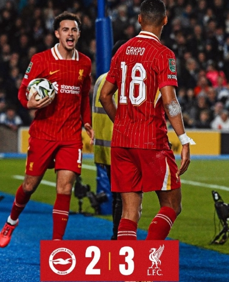 比赛中,上半场兰普泰失单刀,迪亚斯门前失良机,下半场加克波远射破门打破僵局,亚罗萨献神扑,加克波爆射扩大比分,阿丁格拉补射扳回一城,迪亚斯低射破门杀死比赛,兰普泰远射打在宽萨身上变线破门,最终利物浦3-2布莱顿晋级八强。