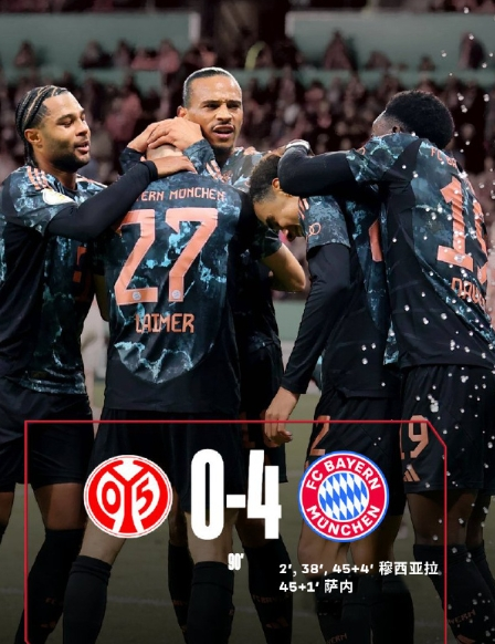 在上周周中惨败给巴塞罗那之后,拜仁就开启了暴走的状态,上一轮联赛客场面对积分榜垫底的波鸿,南大王没有手下留情,直接以5-0的比分血洗了对手,此役迎战同样实力不强的美因茨,拜仁上半场就大开杀戒,其中身价达到了1.3亿欧元的穆夏拉表现神勇,半场上演帽子戏法,完成了职业生涯首次戴帽,再加上萨内的进球,拜仁在下半场鸣金收兵的情况下,仍然客场4-0制造了一场惨案。