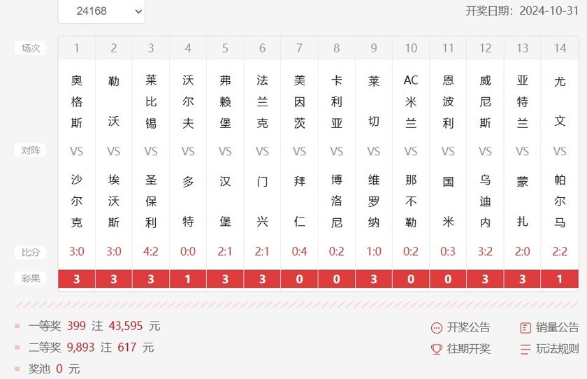 nba直播讯 北京时间10月31日,胜负彩第24168期开奖结果揭晓。