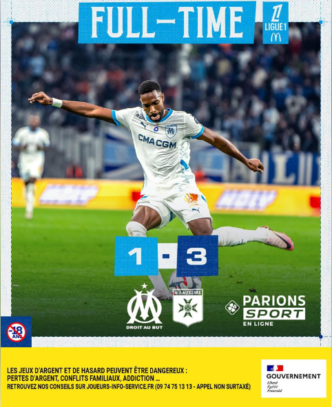 全场比赛结束,欧塞尔凭借着西纳约科、盖坦-佩兰和哈米德-特拉奥雷的进球,以3-1的比分战胜了马赛,成功拿下三分。