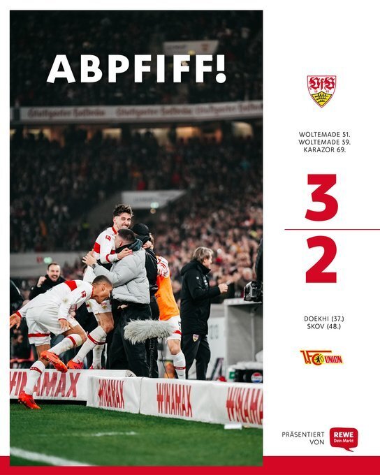 比赛第51分钟,德米洛维奇送出直塞,沃尔特梅德晃过劳诺抽射空门得手,斯图加特1-2柏林联合!
