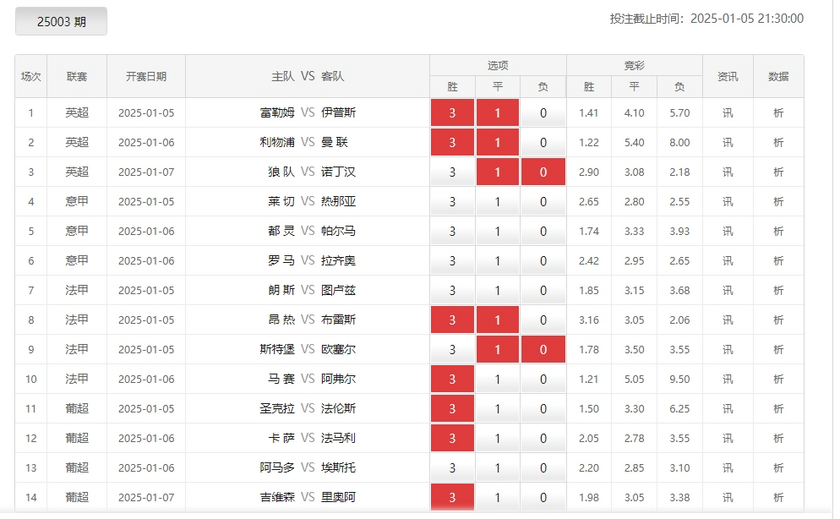今开25003期胜负彩,由3场英超,3场意甲,4场法甲,4场葡超组成。