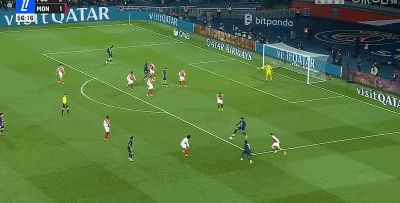 第90分钟,巴黎杀死比赛!反击机会门德斯左路下底横传门前登贝莱推射破门,巴黎4-1摩纳哥。