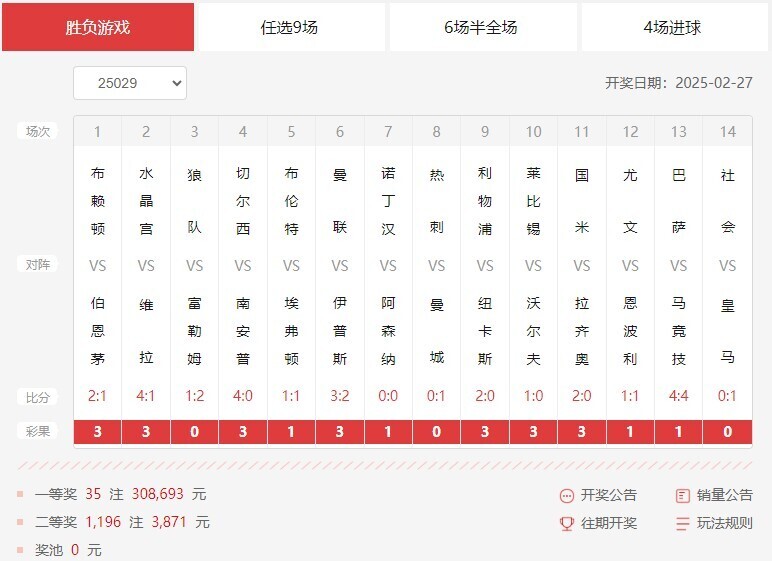 nba直播讯 北京时间2月27日,胜负彩第25029期结束了全部14场比赛的争夺。