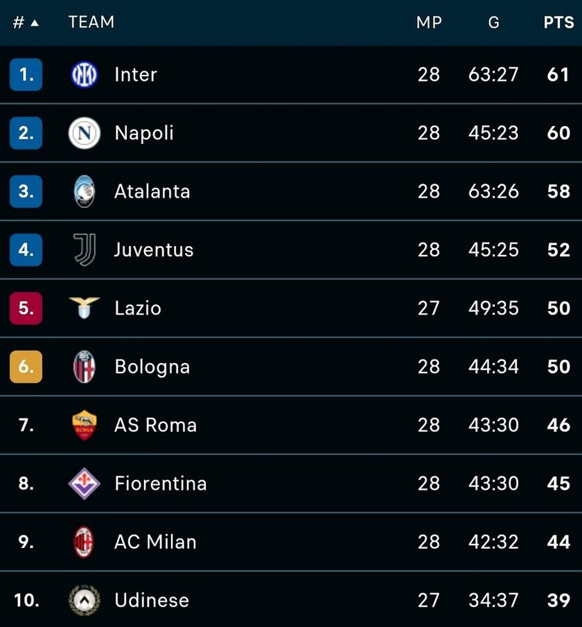- 中游球队表现:拉齐奥、博洛尼亚、罗马、佛罗伦萨和AC米兰等球队在积分榜上形成了第二集团,竞争欧战资格和联赛排名的形势依然胶着。AC米兰通过逆转莱切,积分达到44分,暂时超越罗马,向第四的尤文图斯发起冲击。