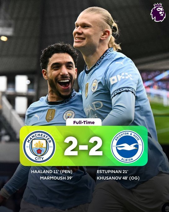 本场比赛中,曼城两度领先但未能守住胜局。哈兰德点射破门,马尔穆什轰出世界波并造点,但布莱顿凭借埃斯图皮尼安的任意球和胡桑诺夫的乌龙球两度扳平比分。尽管曼城在主场对阵布莱顿的历史战绩占据绝对优势(12胜3平),但此役终结了他们对布莱顿的主场10连胜纪录。