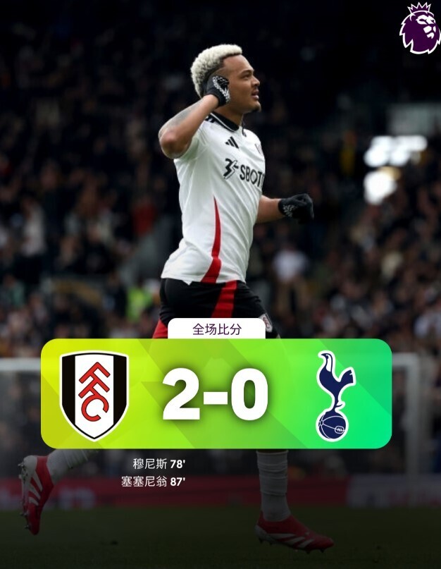 英超第29轮,托特纳姆热刺客场挑战富勒姆。上半场,双方互有攻守,罗梅罗的关键解围和本-戴维斯的失误让比赛充满悬念。下半场,富勒姆替补登场的穆尼斯打破僵局,塞塞尼翁锁定胜局。最终,富勒姆2-0击败热刺,送给对手一场苦涩的失利。