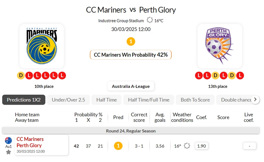 The Central Coast Mariners have registered 2 wins, 6 draws, and 4 defeats in their last 12 encounters with Perth Glory.