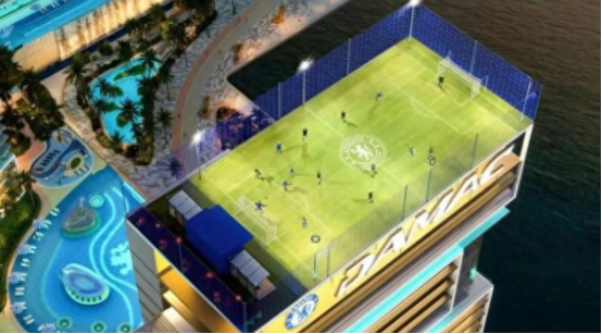 项目最引人注目的当属顶层设计——楼顶将建造符合国际标准的足球场,场地中央镶嵌巨型切尔西队徽,四周环绕着俱乐部吉祥物狮子雕塑群。建筑内部将深度植入足球元素:从大堂的冠军奖杯陈列墙、电梯间的球星手模印记,到客房内的定制球衣纹理墙面,形成沉浸式足球文化体验空间。所有建材均选用意大利进口大理石、德国精工厨卫设备等顶级配置,目标打造中东最奢居所。