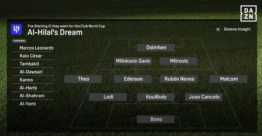 若一切顺利,利雅得新月可能在世俱杯上派出的全外援梦幻首发阵容为:布努;洛迪、库利巴利、坎塞洛;特奥、埃德森、鲁本·内维斯、马尔科姆;米林科维奇 - 萨维奇、米特洛维奇、奥斯梅恩。不过,该计划能否最终实现还存在诸多变数,比如球员转会是否能全部成功,以及球队是否能解决外援名额限制等问题。
