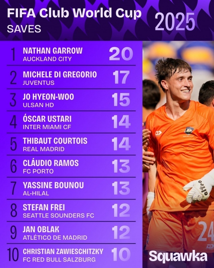 nba直播讯 北京时间6月28日,Squawka统计了本届世俱杯小组赛球队门将成功扑救次数,并列出了榜单,奥克兰城门将加罗以20次扑救领跑扑救榜,库尔图瓦、赵贤祐、乌斯塔里在榜。