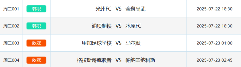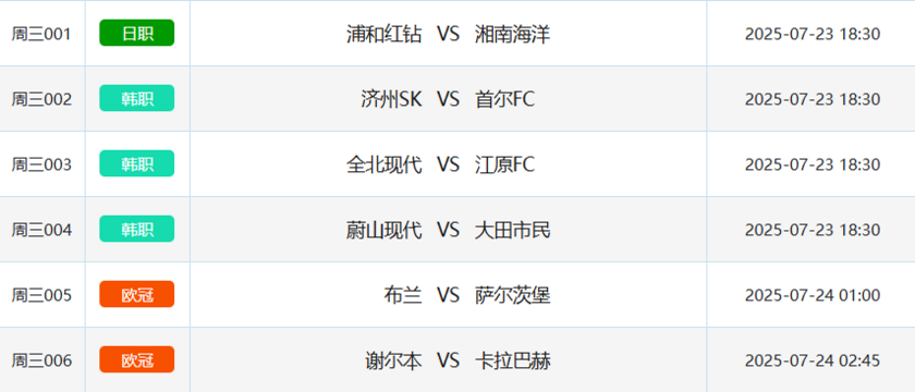 nba直播讯 北京时间7月22日(周二)竞彩将开售4场比赛,包括2场韩职和2场欧冠资格赛。7月23日(周三)安排6场赛事,含1场日职、2场韩职和2场欧冠资格赛。7月24日(周四)则有4场欧罗巴资格赛待开售。