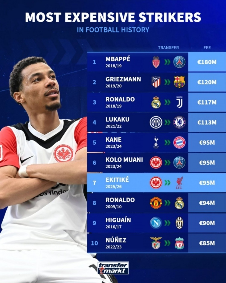 nba直播讯 2025年7月24日,德国转会市场统计了足坛历史前锋(中锋)的转会价格,并列出榜单,刚刚从法兰克福转会利物浦的埃基蒂克排名并列第5位,姆巴佩1.8亿欧居首,格里茨曼1.2亿欧次席,C罗两次入选。