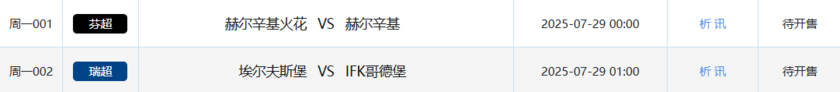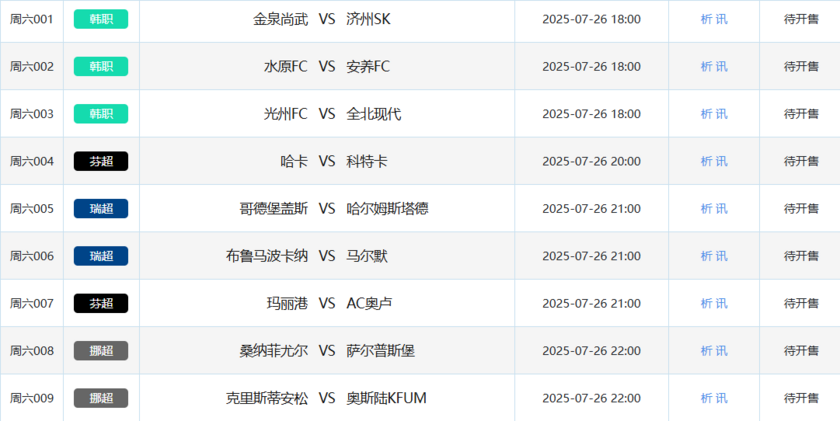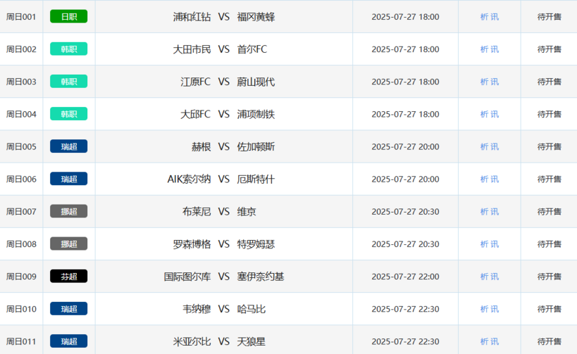北京时间7月25日,本周五竞彩开售7场比赛,包括1场芬超、1场挪超和5场美职联。本周六竞彩开售17场,涵盖3场韩职、4场挪超、3场瑞超、2场芬超和5场美职联。周日竞彩开售11场,包括1场日职、3场韩职、4场瑞超、2场挪超和1场芬超。下周一竞彩开售2场,分别为1场芬超和1场瑞超。