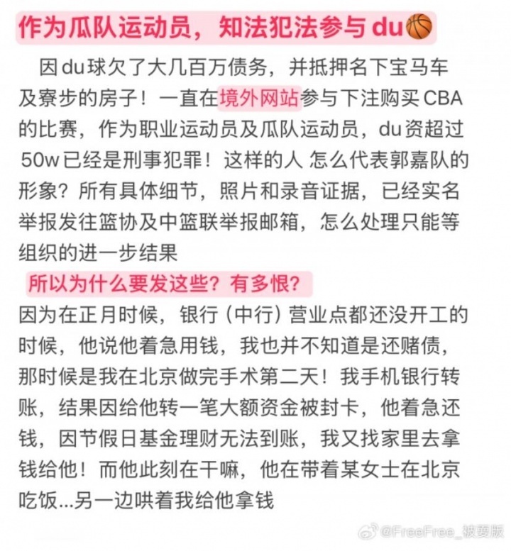 涉嫌违法问题:举报人指控徐杰通过境外网站参与CBA赌球,累计下注超50万元,已达刑事立案标准。为偿还巨额赌债,他还抵押了宝马车及东莞房产,爆料人公开了其身负数百万债务的转账记录,并表示已向中国篮协及纪检部门提交证据,但关键的赌球网站记录尚未披露。