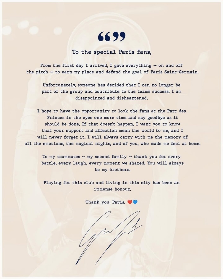 此次告别源于巴黎圣日耳曼将其排除在欧洲超级杯比赛名单之外。巴黎圣日耳曼主帅恩里克在欧超杯赛前新闻发布会上表示,这是他的决定,原因是球队需要不同风格的门将。