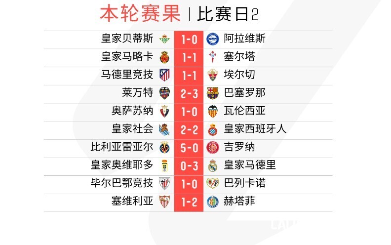 其他场次中,比雷亚雷尔5-0大胜赫罗纳,展现强大的攻击力;贝蒂斯1-0小胜阿拉维斯,马洛卡1-1战平埃尔塔,奥萨苏纳1-0击败瓦伦西亚;皇家社会与西班牙人2-2激战成和,毕尔巴鄂竞技1-0战胜巴列卡诺;塞维利亚1-2不敌赫塔菲,遭遇开局两连败。