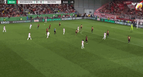 取得领先后的拜仁继续掌控着场上局面,不断对韦恩威斯巴登的防线发起冲击。第27分钟,迪亚斯门前包抄,近距离的打门被对方防守球员奋力挡出。第32分钟,格雷罗在点球点附近背身抽射,对方门将反应迅速,飞身将球扑出。上半场结束,拜仁1-0暂时领先。
