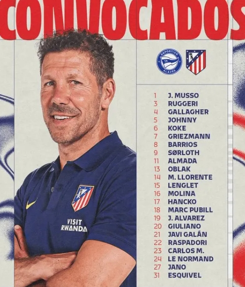 【前锋】7-格列兹曼、9-索尔洛特、11-阿尔马达、19-阿尔瓦雷斯、22-拉斯帕多里、23-卡洛斯-马丁