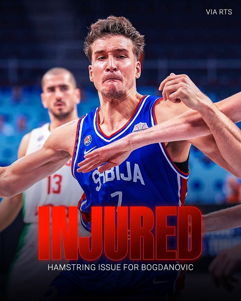 nba直播讯 北京时间今天凌晨,2025年欧锦赛小组赛塞尔维亚对阵葡萄牙的比赛中,塞尔维亚队长博格丹-博格达诺维奇腿筋受伤。