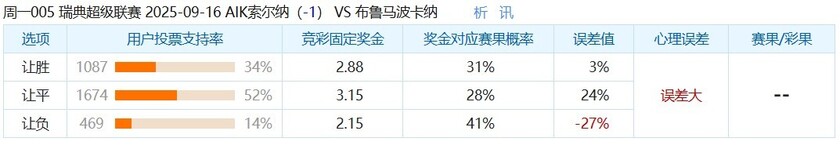 本场比赛中,选择让球负选项的球迷偏少了,只有14%的球迷选择让球负选项,这场比赛中,大家都看好主队AIK索尔纳够赢或者大胜赢得这场比赛,不看好布鲁马波卡纳,但是这也与奖金对应赛果概率的41%相差27%。