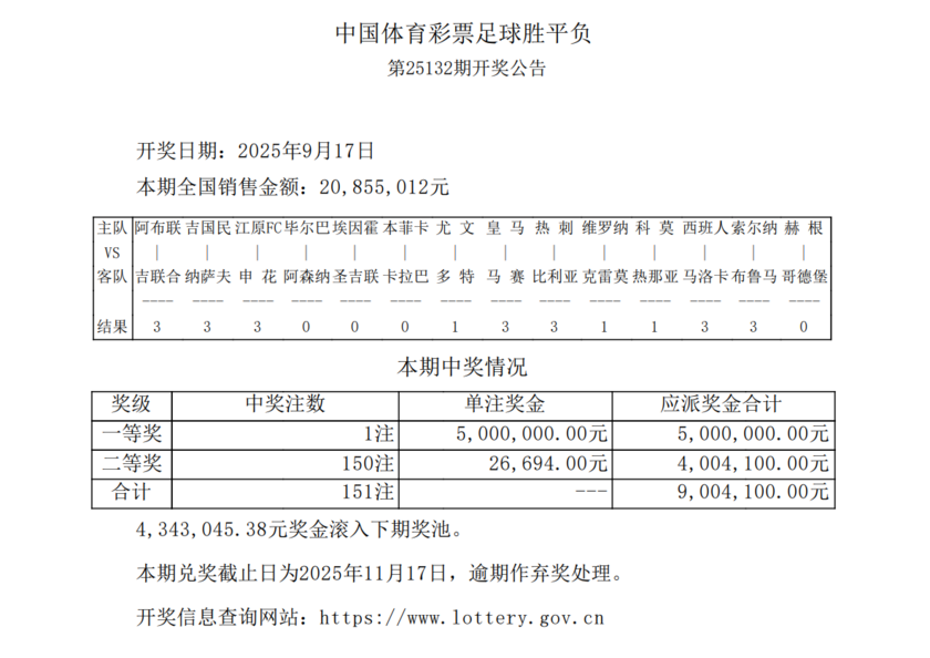 nba直播讯 9月17日,胜负彩第25132期开奖结果揭晓。本期14场一等奖仅开出1注,独揽500万大奖,434万滚存奖金被带入9月17日晚停售的第25133期竞猜。二等奖开出150注,单注奖金26,694元;任九开出531注,单注奖金20,291元。本期足彩总销量为20,855,012元,任九投注总额为16,835,480元。
