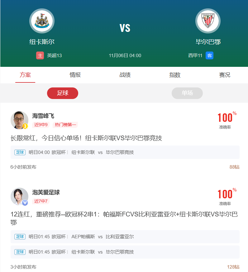 周三013欧冠推荐:纽卡斯尔VS毕尔巴鄂竞技