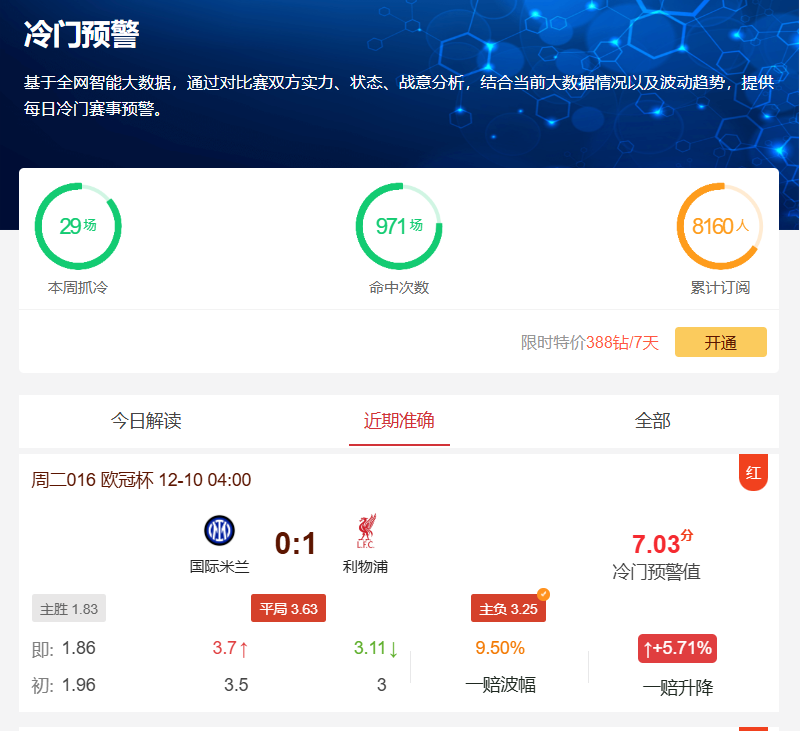 昨日欧冠国际米兰VS利物浦的比赛中,尽管初始赔率显示双方分出胜负的概率较大(胜平负赔率1.83:3.63:3.25),但比赛最终打出了0-1负的大冷门,公推精准命中!