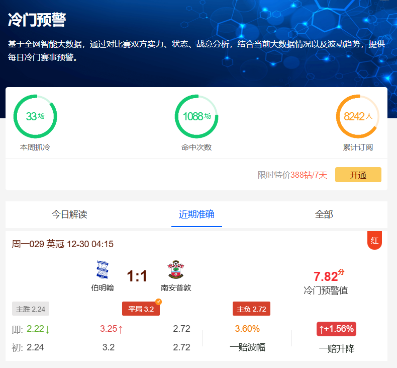 昨晚冷门预警工具再次成功预测6场比赛赛果,在英冠伯明翰VS南安普顿的比赛中,尽管初始赔率显示伯明翰占优(胜平负赔率2.24:3.2:2.72),但南安普顿最终以1-1爆冷逼平;米德尔斯堡VS赫尔城也同样是0-1爆出了4.4倍赔率主负的大冷。同时还有英甲彼得堡联1-1平雷丁、巴恩斯利0-2负林肯城、英冠考文垂0-2负伊普斯维奇以及沙特联塞哈特海湾0-1负哈萨征服等六场赛事预测充分展现了我们工具的精准预测能力。
