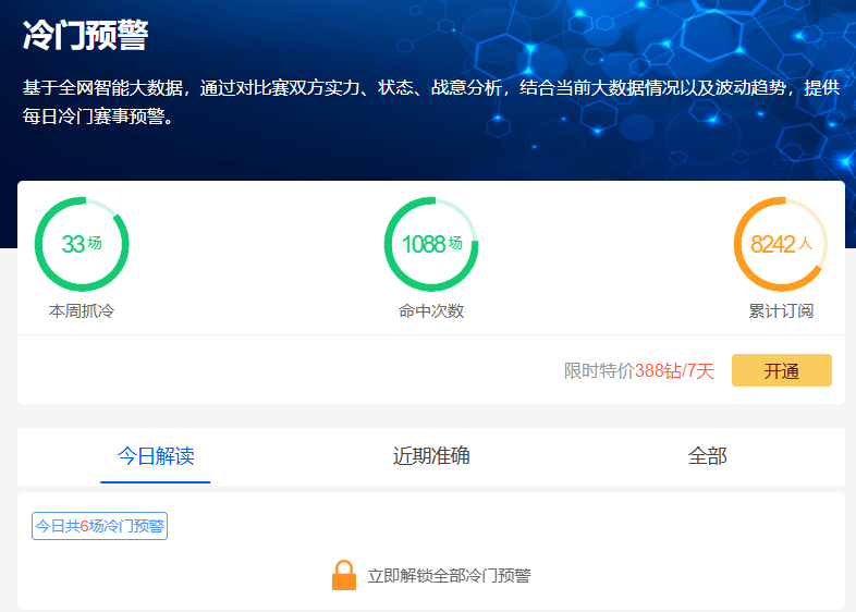 今日竞彩足球共开设11场赛事,其中不乏看似强弱分明的对决,但比赛胜负往往存在变数。目前冷门预警系统已锁定六场潜在冷门赛事,将帮助您有效规避竞彩路上的陷阱。新用户现在还可免费领取价值388元的7天数据会员服务,欢迎点击下方文字立即获取,助您竞彩投注更加得心应手。