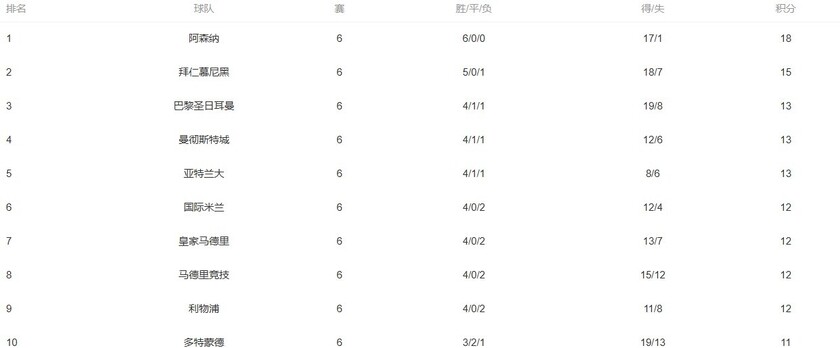 联赛阶段形势:阿森纳、拜仁接近锁定前八