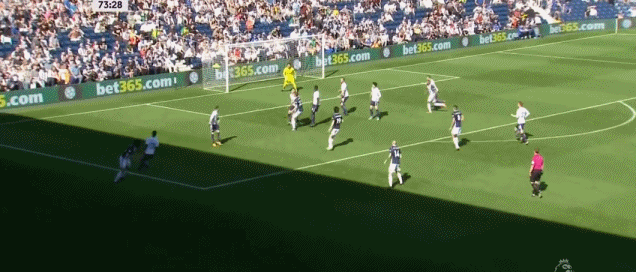 在防守西布朗的定位球时,凯恩回到禁区参与防守,面对对方的传中,凯恩体内的射手本能突然觉醒,卡位、前插、摆腿、垫射,一个射手的优秀基本功在这一刻展现得淋漓尽致,眼看着与射手榜头名的进球差距就能缩小到3个了....只可惜这门前还有个法国老哥啊,浓眉大眼的洛里没有领会凯恩的意思啊,一个神扑把皮球拒之门外。