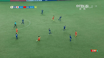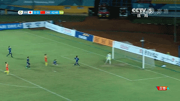 上半场比赛中,日本队面对中国队体格优势明显,体能不输技术不差的前场三人进攻组合时,压力非常大。中国队在上半场就完成了8次射门,而日本队只有2次。图中回合,反击中中国队直接长传找禁区中的李影,后者直接完成头球攻门。