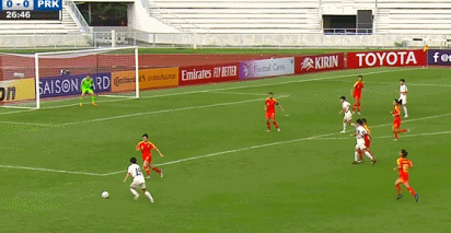 第36分钟,朝鲜队9号吴玉宗禁区内拿球转身起脚射门攻入死角,0-2,中国U16女足落后。