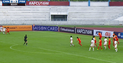 第82分钟,朝鲜队5号洪松行远射进网,中国U16女足0-4落后。